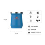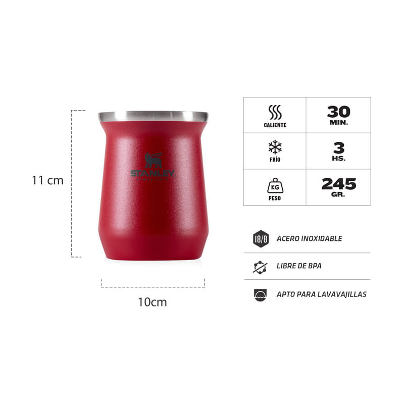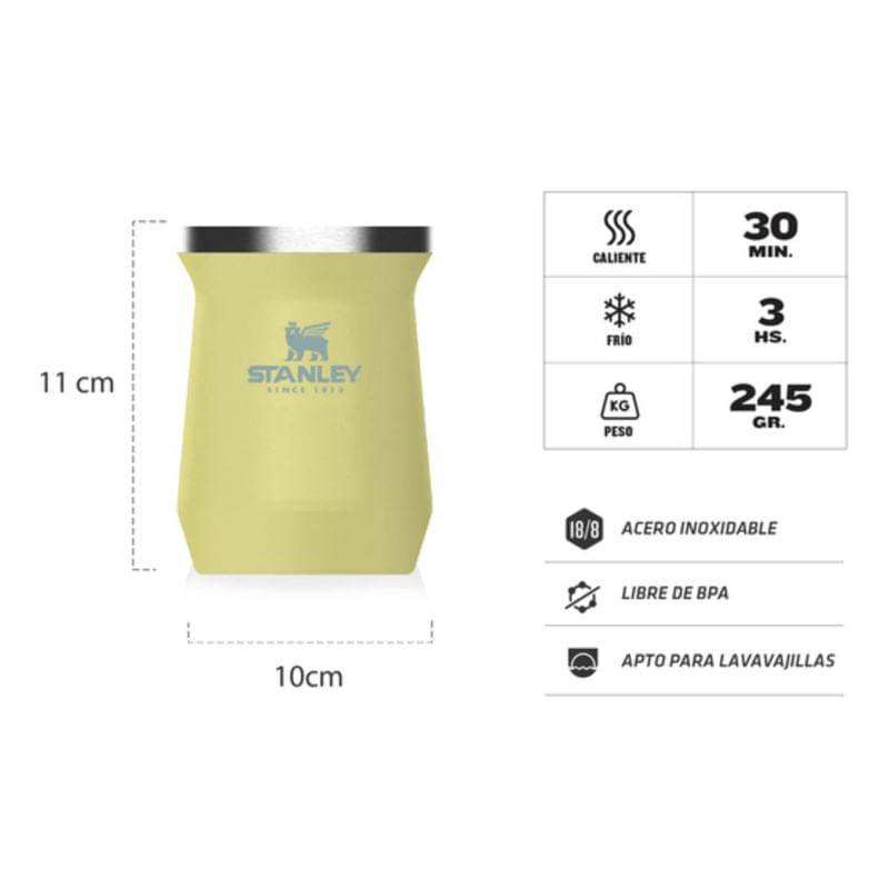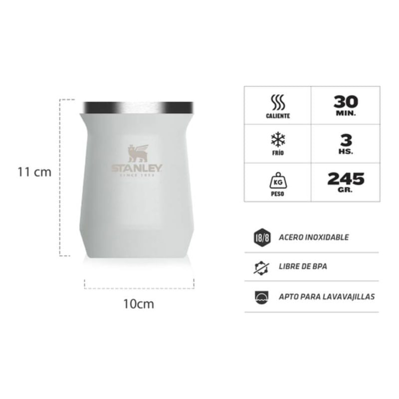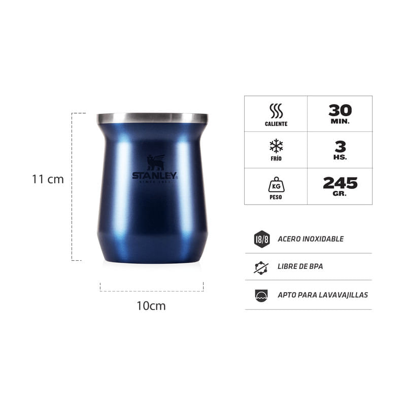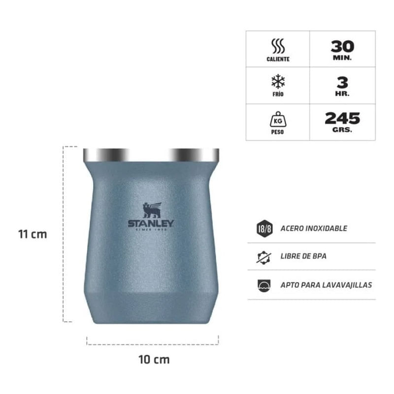 El mate Stanley mantiene la temperatura durante toda la cebada. Es práctico e higiénico, posee una apertura de boca ancha para facilitar el llenado y la limpieza. Se adapta perfecto al bolsillo trasero. Tapa de acero mecanizado, para mayor durabilidad