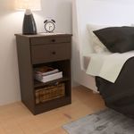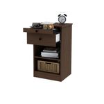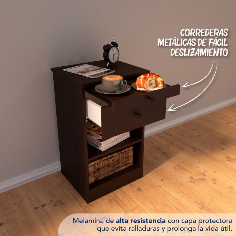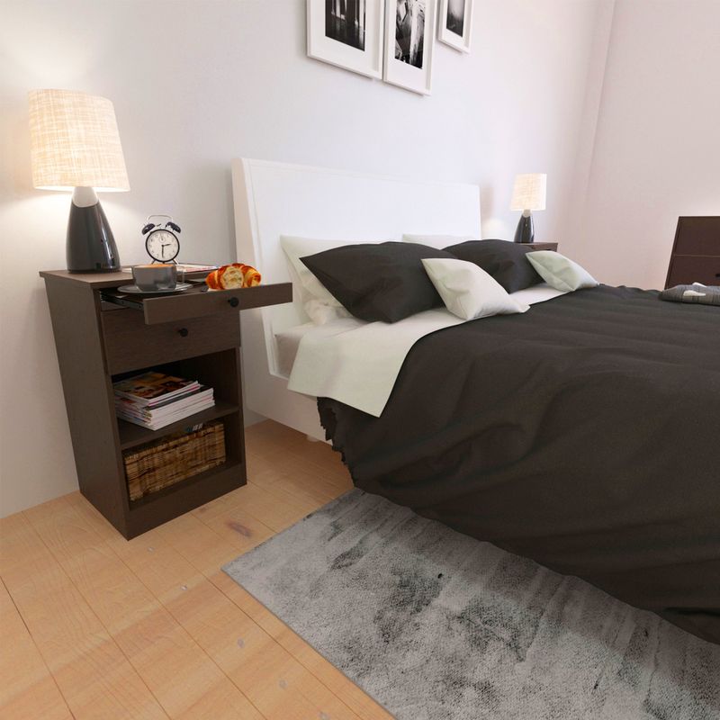 Si sos fan de desayunar en la cama esta es la mesita de luz para vos. Contiene una bandeja corrediza que podes usar para apoyar lo que necesites. Además cuenta con un cajón y un estante regulable en altura para ubicar según tus necesidades.