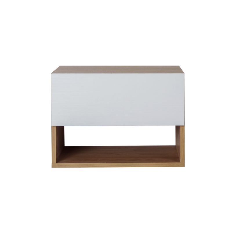 La mesa de luz flotante moderna en color Hickory Blanco tiene cajón reversible y un diseño que ahorra espacio. ¡Dale un toque lindo a tu habitación!