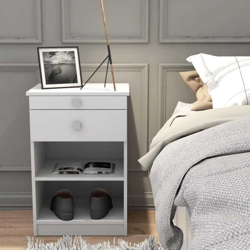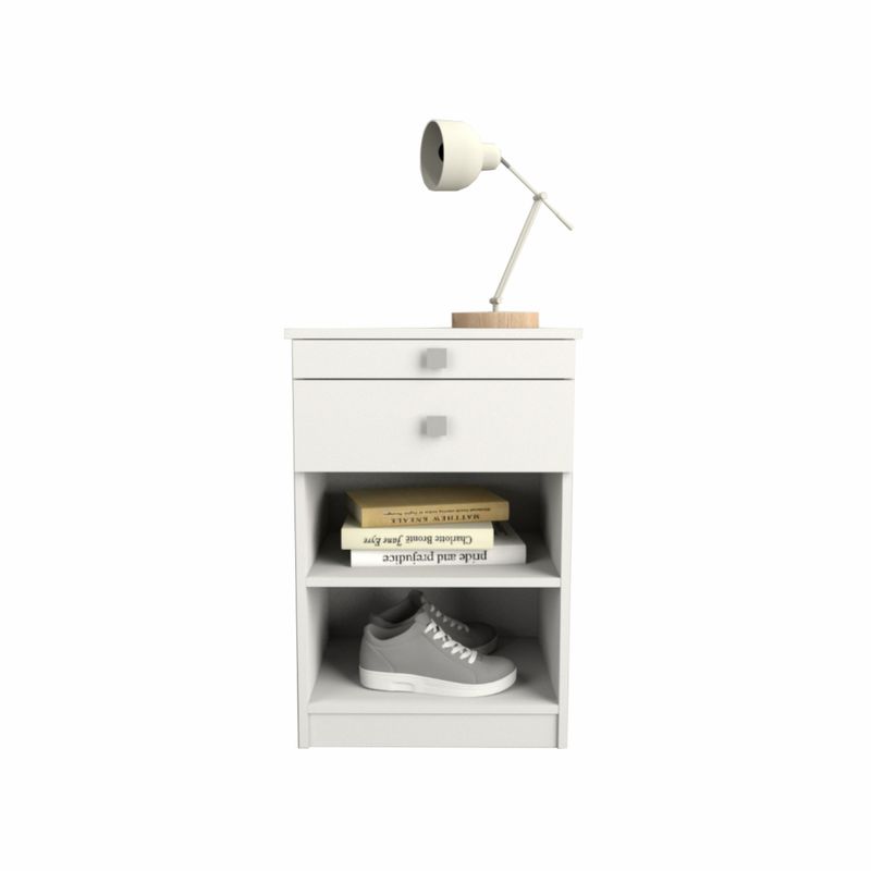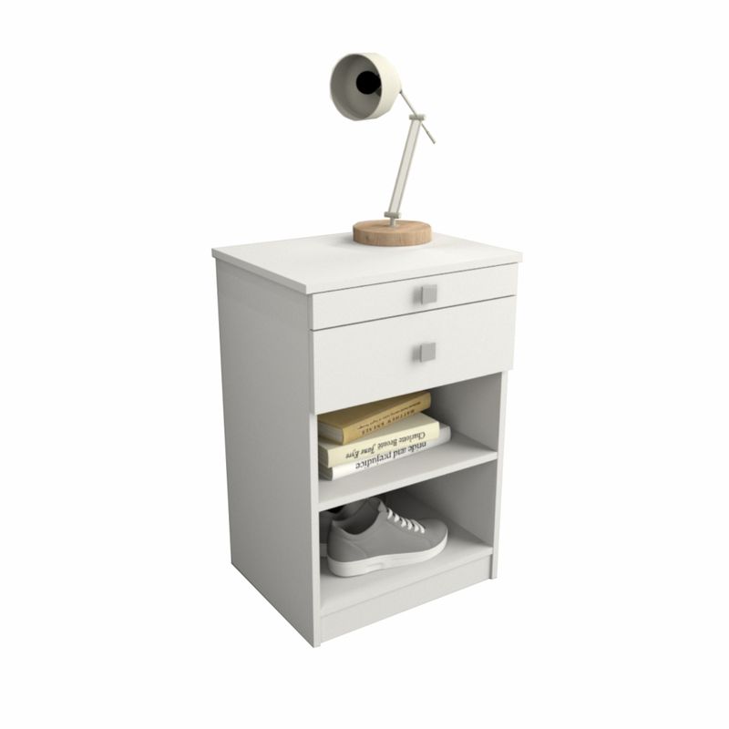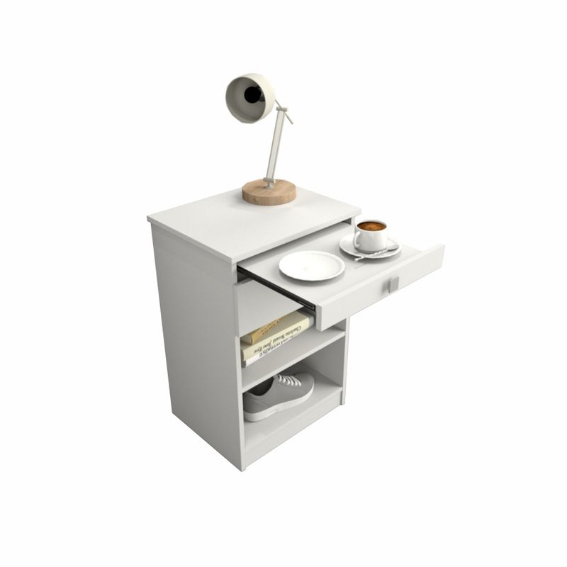 La mesa de luz con bandeja desayunadora está fabricada en melamina de alta calidad, y cuenta con la bandeja extensible para usarla al momento del desayuno y luego volverla a su posición original.