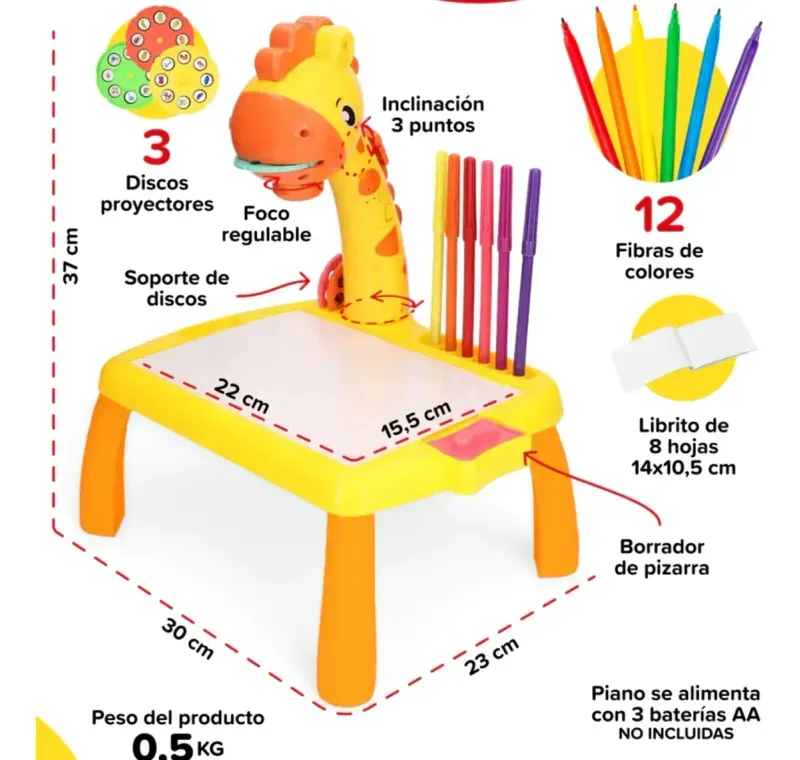 El proyector cuenta con luz y sonido, lo que añade un elemento divertido a la experiencia de dibujo. Los niños podrán disfrutar de horas de entretenimiento mientras desarrollan habilidades motoras y cognitivas. Esta mesa didáctica es una excelente opción para fomentar el aprendizaje a través del juego.
