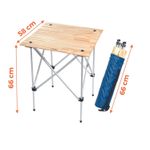 La estructura de aluminio es plegable y la tapa de madera se enrolla para poder guardarla en su funda de transporte.