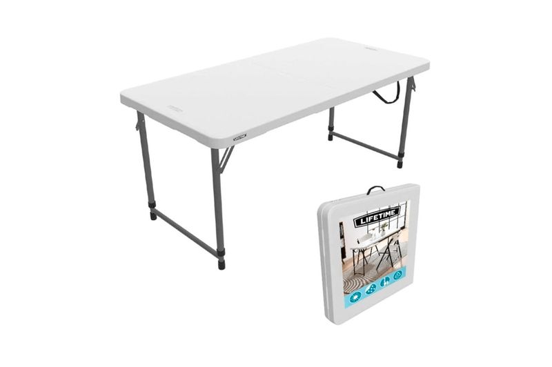 La Mesa Rectangular Lifetime de polietileno de alta densidad, liviana y de gran firmeza. Plegable y con altura regulable. Cuenta con manija de agarre para trasladarlas de manera cómoda y segura tipo valija. La tapa de la mesa posee un inhibidor de rayos U.V que hace que sea la mejor opción para el aire libre y los distintos climas. Cuenta con 3 alturas regulables: 91 cm es ideal para usarla como buffet, mesa de bebida o para mostrar productos, la elevación de 74 cm es la altura de mesa estándar que te brinda un espacio extra a invitados, muy útil tanto en la oficina como en la casa o al aire libre y la de 60 cm es ideal para que los chicos tengan su único y perfecto lugar para pintar, jugar o tomar la merienda.