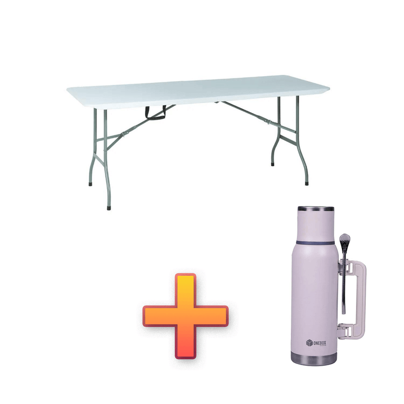Combo mesa plegable de camping tipo maletín, valija + termo de acero inoxidable de doble pared.