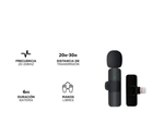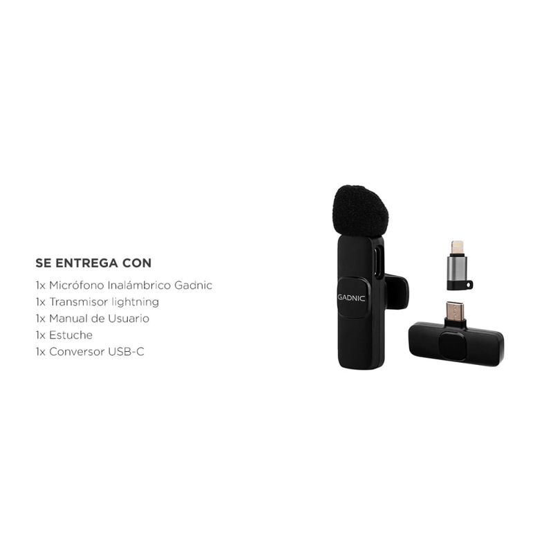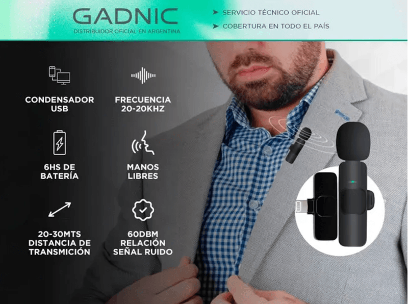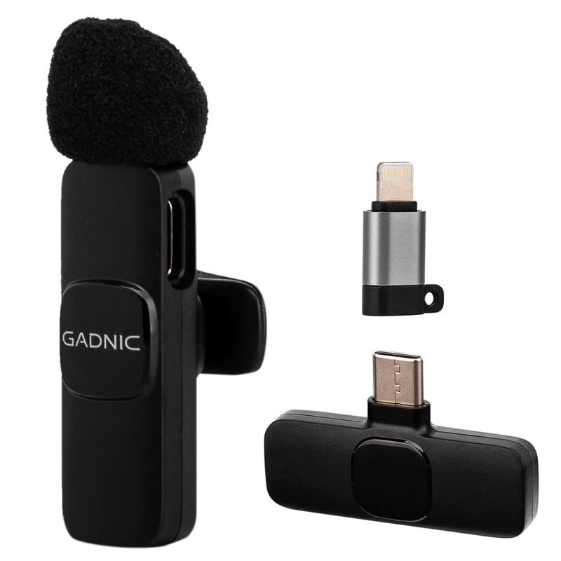 El innovador micrófono de solapa Gadnic es único, ya que incluye un transmisor y un receptor que se conectan automáticamente, por lo que no se requiere ninguna aplicación o Bluetooth. Sólo tiene que conectar el transmisor a su dispositivo y podrá utilizarlo de inmediato.