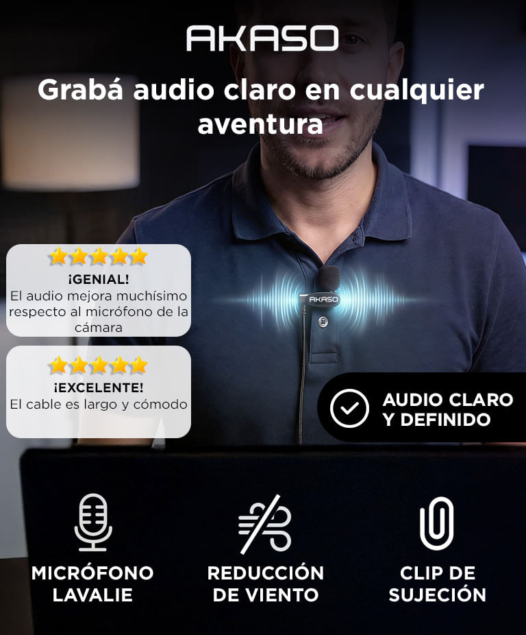 El micrófono externo AKASO permite capturar la voz con mayor claridad que el micrófono integrado de muchas cámaras de acción. Mejora la calidad del audio en vlogs, deportes o grabaciones en movimiento.
