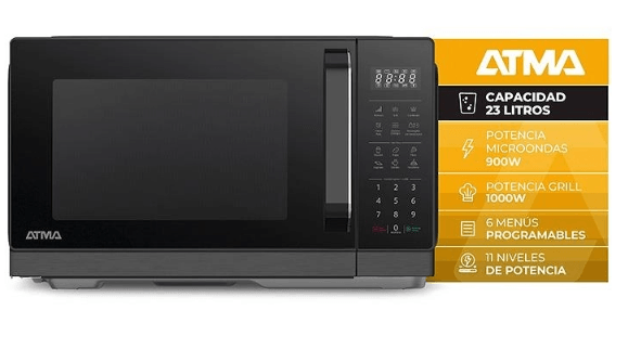 El Microondas Atma MATDGB23CN, de 23 litros y 900W, incluye grill, 8 menús programados, 5 niveles de potencia, descongelamiento automático, reloj/timer, bandeja giratoria, luz LED interior y traba de seguridad para niños, ofreciendo facilidad, precisión y seguridad al cocinar.