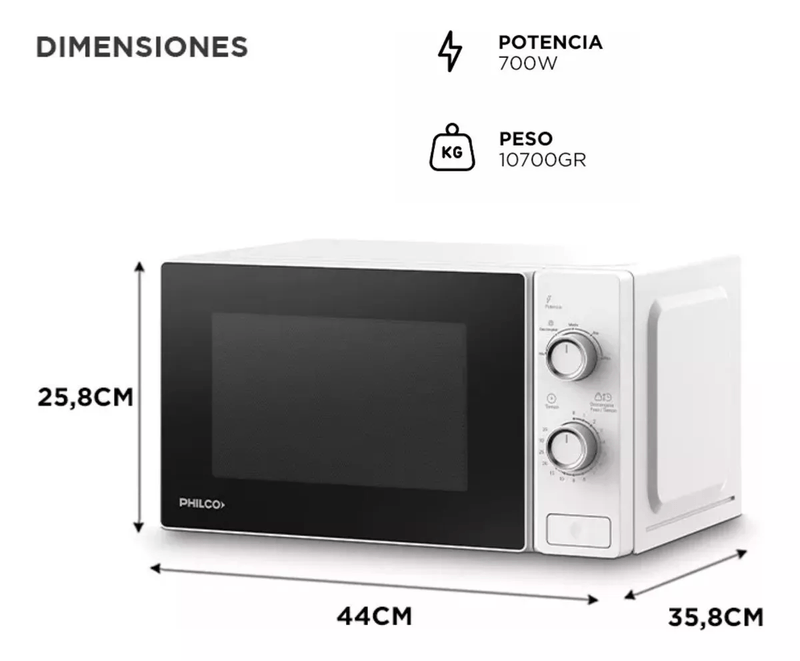 Con dimensiones de 44 cm de ancho, 35.8 cm de altura y 25.8 cm de profundidad, este microondas es compacto y fácil de ubicar en cualquier espacio. Su luz interior te permite visualizar el proceso de cocción, asegurando que tus platillos queden perfectos en todo momento.