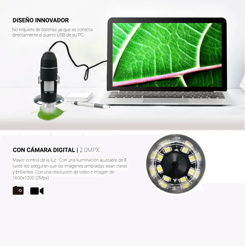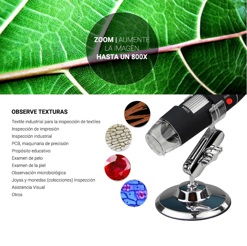 El Microscopio Digital con Cámara U800X es una herramienta versátil y accesible para la exploración del mundo microscópico. Con un aumento de hasta 800X y una cámara de 2 megapíxeles, este microscopio proporciona imágenes nítidas y detalladas, ideales para el aprendizaje, la investigación y diversas aplicaciones profesionales. Su diseño intuitivo permite un uso sencillo, y la conectividad USB facilita la transferencia de imágenes y videos a tu computadora, lo que te permite documentar y analizar tus observaciones de manera efectiva. Perfecto para estudiantes, educadores y entusiastas de la ciencia, este microscopio digital te abre las puertas a un mundo de descubrimientos.
