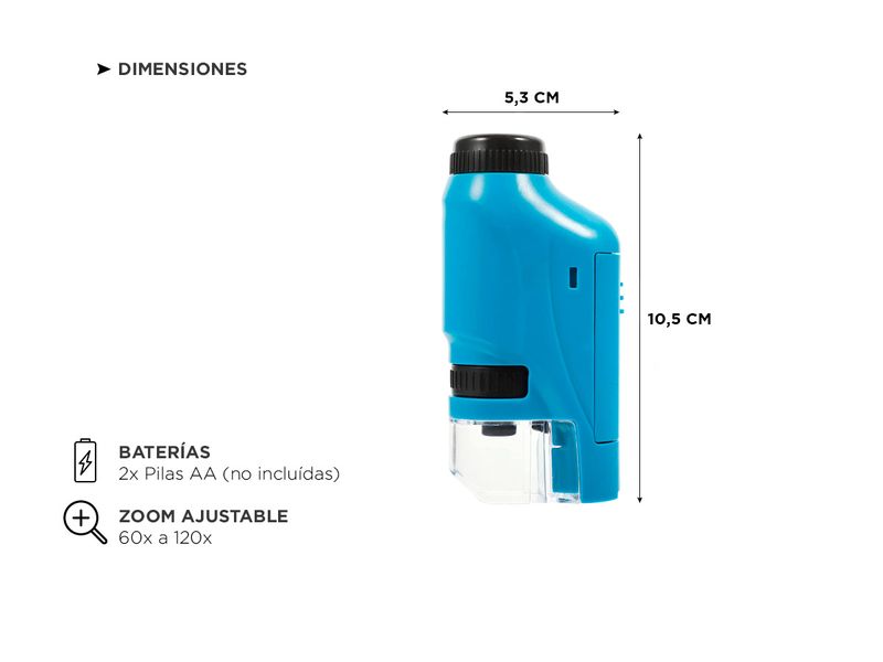 Este microscopio es especial para niños y niñas, ya que es fácil de usar, portátil y tiene una ampliación ajustable de 60x y 120x. Podrás ver detalles sorprendentes en tus muestras y hacer descubrimientos emocionantes. Ya sea en la escuela, en casa o al aire libre, ¡el microscopio mini es la herramienta perfecta para explorar el mundo microscópico!