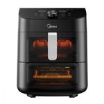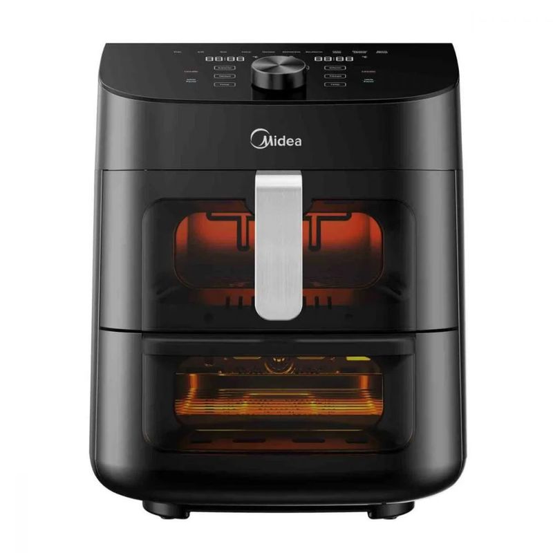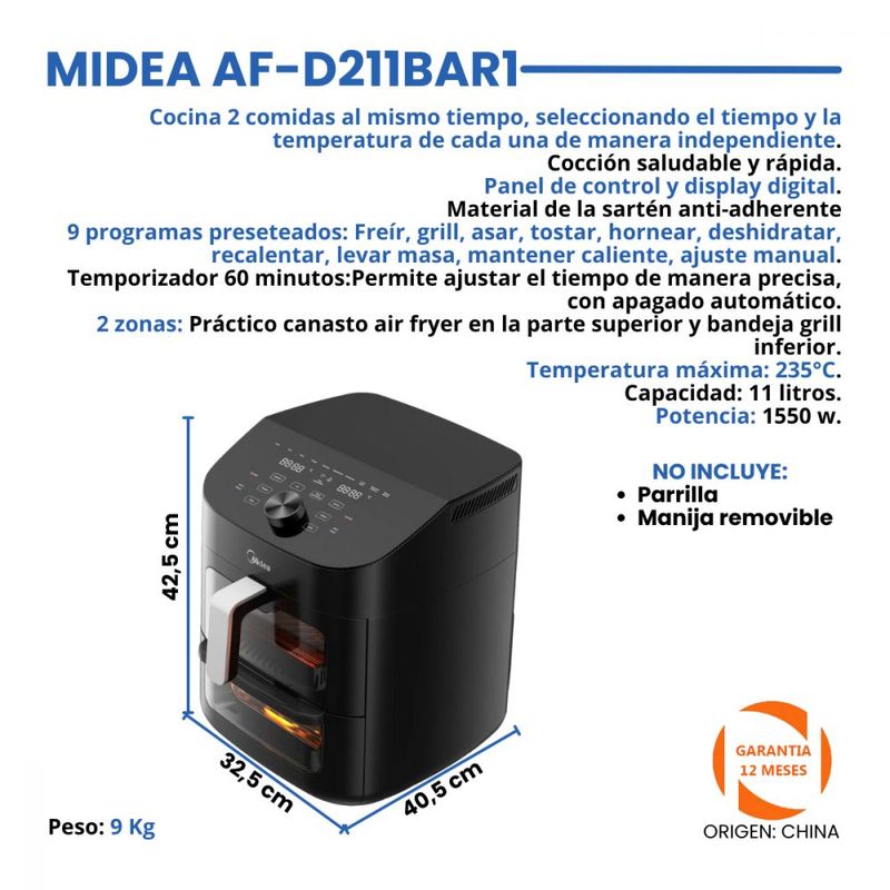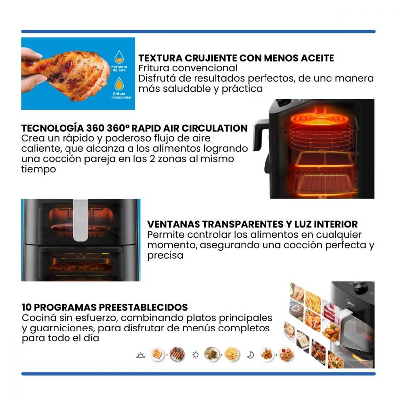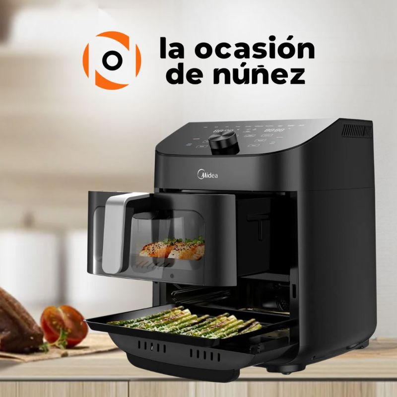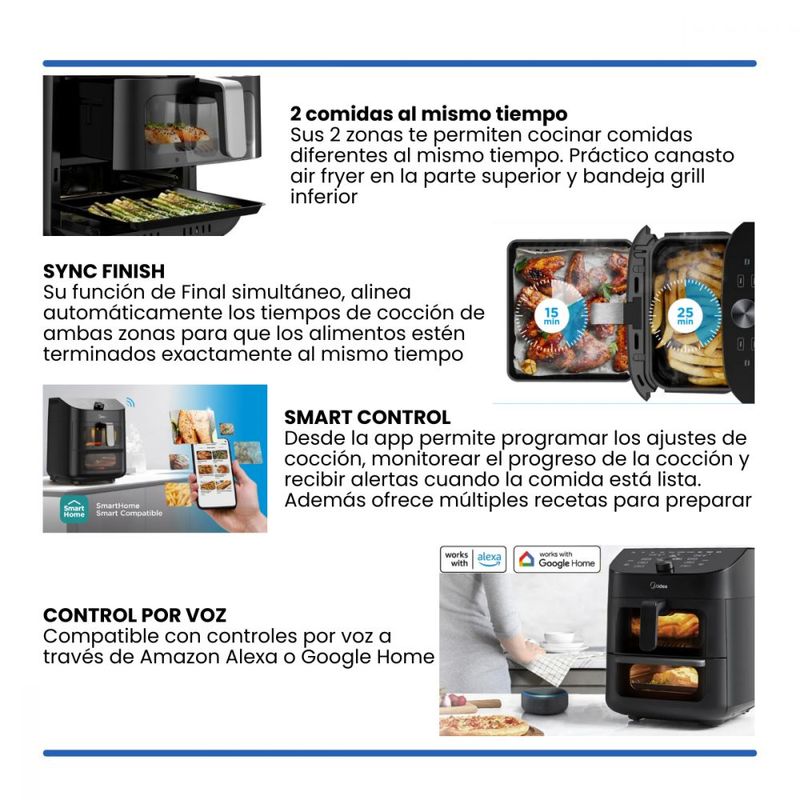 2 zonas: Práctico canasto air fryer en la parte superior y bandeja grill inferior.