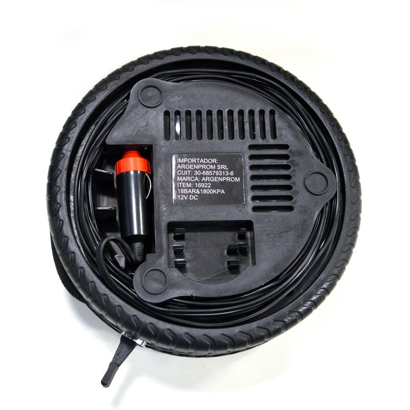 Presión: 150 psi. Potencia: 120W. 3 picos intercambiables: Automóvil, bicicleta y pelotas. Cable: 3 mts aprox. Unidad de Medida: BAR/KPA.