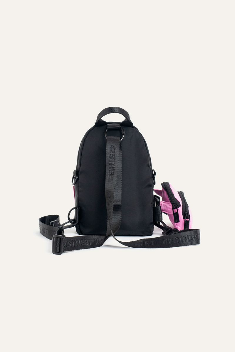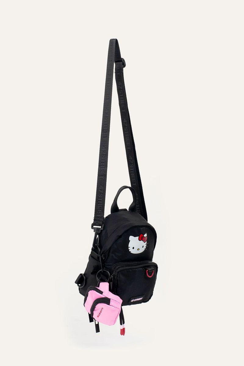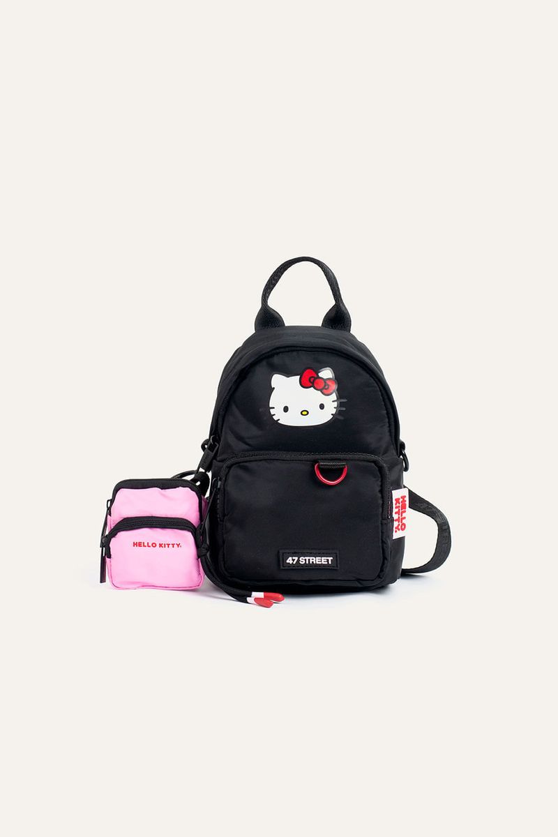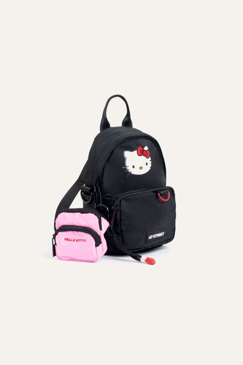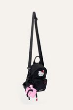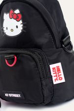 Mini mochila con estampa de Hello Kitty, ideal para llevar lo esencial. Cuenta con bolsillo delantero y llavero extraíble de mini riñonera que suma un detalle funcional. Incluye tira extraíble que permite usarla también como bandolera. Confeccionada en nylon, material resistente, repelente al agua y de fácil limpieza. Producto con licencia oficial de Sanrio.