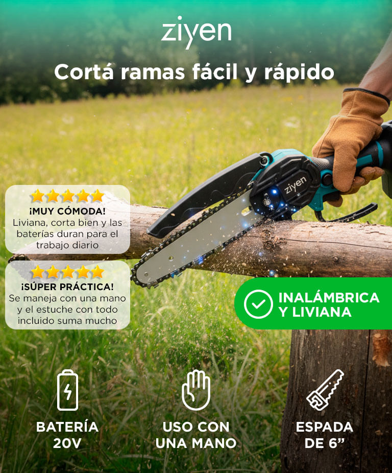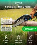 La Mini motosierra Ziyen permite cortar ramas y realizar podas livianas de forma práctica. Su diseño compacto facilita el control en trabajos de jardín.