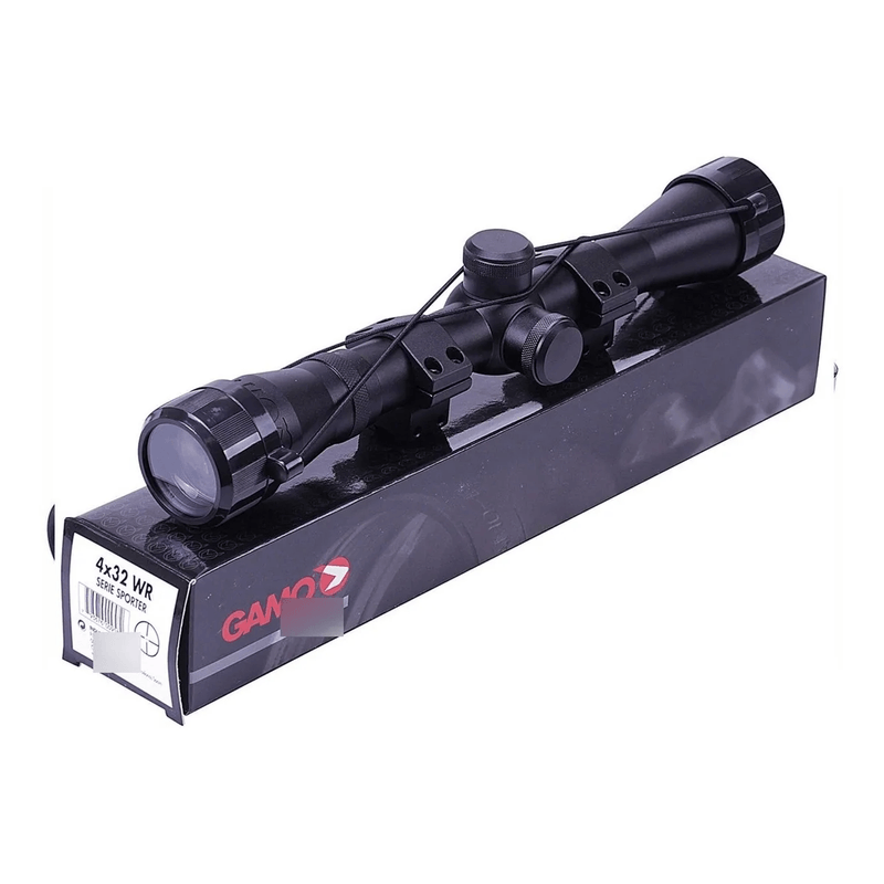 La mira telescópica Gamo VE4x32WR es un visor de aumento fijo 4x con una lente objetivo de 32 mm, diseñado para carabinas de aire comprimido. El sufijo "WR" significa "Water Resistant" (resistente al agua).