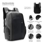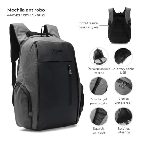 Mochila antirobo modelo Wanderlust GO con diseño pensado para seguridad y practicidad: puerto y cable USB integrados, múltiples bolsillos internos, y tira trasera para engancharla al carry-on. Medidas aproximadas 44 × 31 × 13 cm. Perfecta para viajar o el transporte diario con comodidad y protección.
