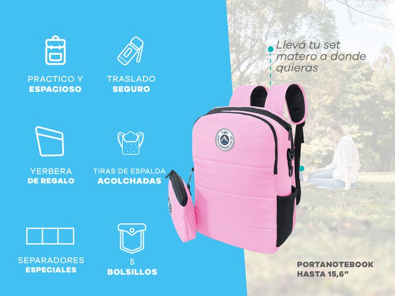 Mochila Matera porta notebook Tgo con múltiples bolsillos y yerbero de regalo.
