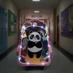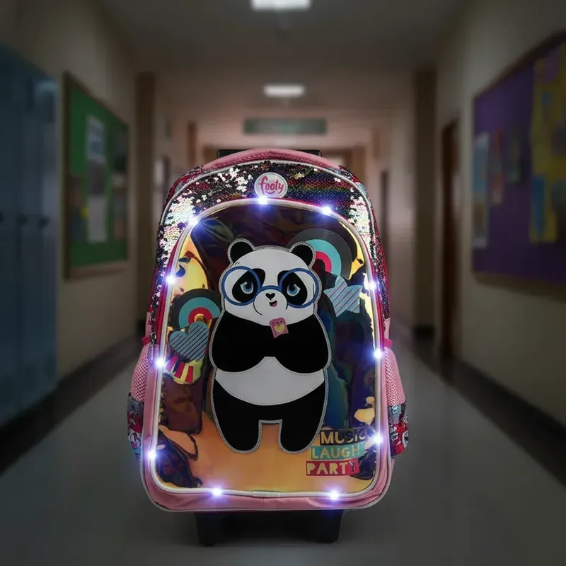 Modelo Panda music: Carrito de 18p. Con tiras de espalda regulables. Diseño holograma estampado y aplique de PVC. Frente con diseño exclusivo, detalles con lentejuelas reversibles Y LUZ LED!