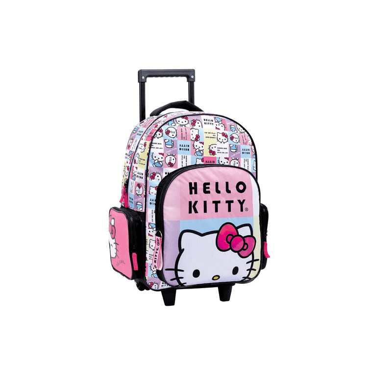 Mochila con carro Hello Kitty, con un cierre principal y dos bolsillos laterales, uno de red. Incluye sección identificatoria.