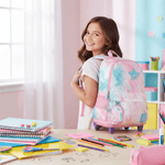 Mochila carro 18 pulgadas ideal para uso diario con 1 compartimento con cierre. Ruedas de goma y carro extensible semi automático. Estampa con holograma y aplique con glitter Tiras reforzadas y bolsillos laterales para botella de agua. Monedero de regalo. Altura x Ancho x Profundidad: 47cm x 31 cm x 10 cm
