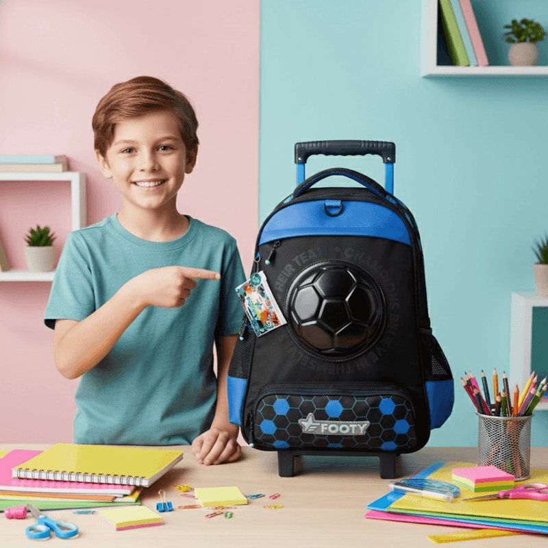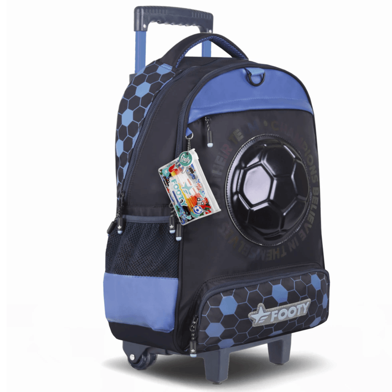 La Mochila con Carrito Footy Pelota 18" es ideal para los chicos que buscan diseño, comodidad y resistencia en su día a día escolar. Su frente con pelota termoformada tornasolada y bolsillo inferior simil pelota de goma la convierte en una mochila única y súper llamativa.