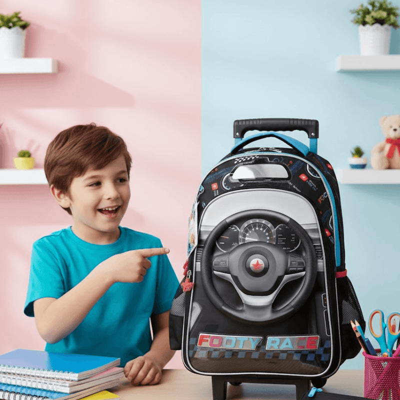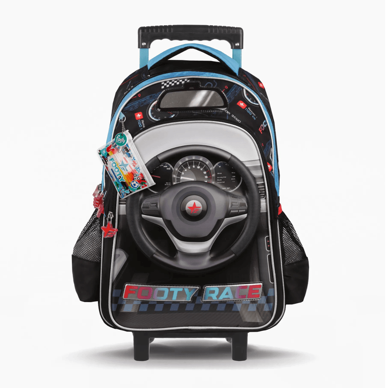 La Mochila con Carrito Footy Volante 18" combina un diseño automotriz único con gran capacidad y resistencia. Su frente con volante termoformado y el aplique de espejo le dan un estilo dinámico ideal para los fanáticos de los autos.
