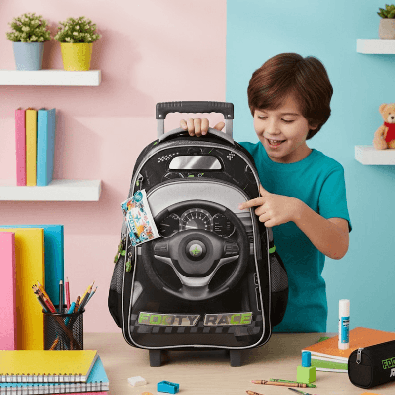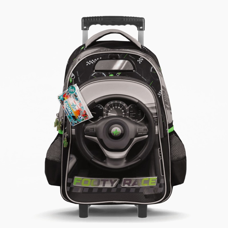 La Mochila con Carrito Footy Volante 18" combina un diseño automotriz único con gran capacidad y resistencia. Su frente con volante termoformado y el aplique de espejo le dan un estilo dinámico ideal para los fanáticos de los autos.
