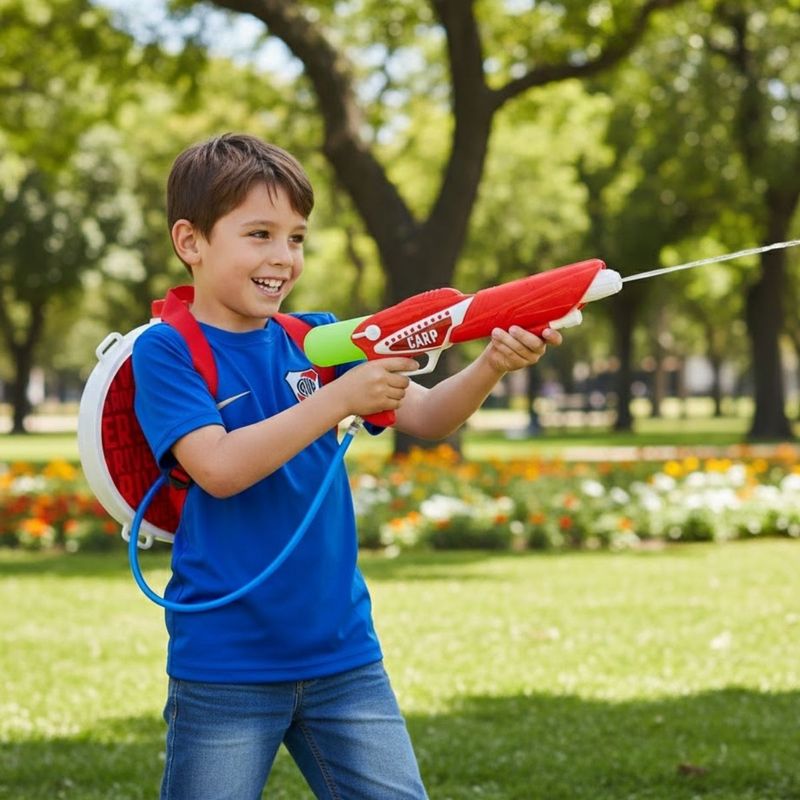 ¡Lleva la diversión al siguiente nivel con la Mochila de Agua Circular + Pistola de Agua River Plate! Perfecta para las batallas de agua, esta mochila asegura horas de diversión al aire libre.
