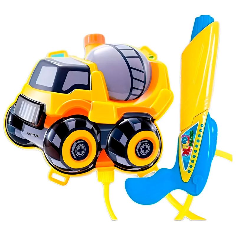 Mochila de agua con pistola temática de camión de construcción, perfecta para juegos al aire libre. Sistema de bombeo fácil de usar y correas regulables. Medidas aproximadas: