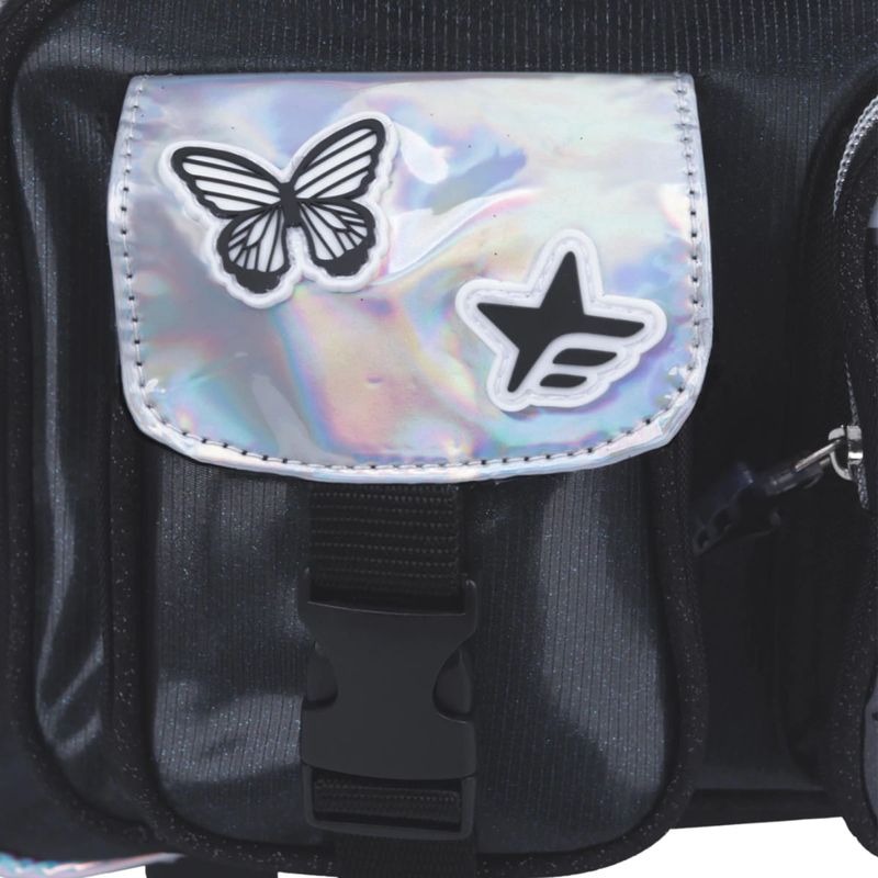 • 4 bolsillos frontales, uno con glitter plastificado y aplique de mariposa holográfica