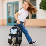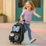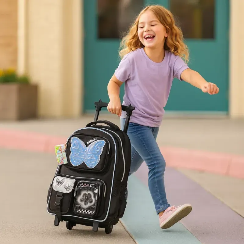 Esta mochila de carrito de 18 pulgadas combina diseño llamativo, gran capacidad y máxima resistencia para el uso escolar diario. Su material de PU texturizado con lúrex, los detalles en glitter y el aplique de mariposa holográfica le aportan un estilo moderno y distintivo.