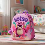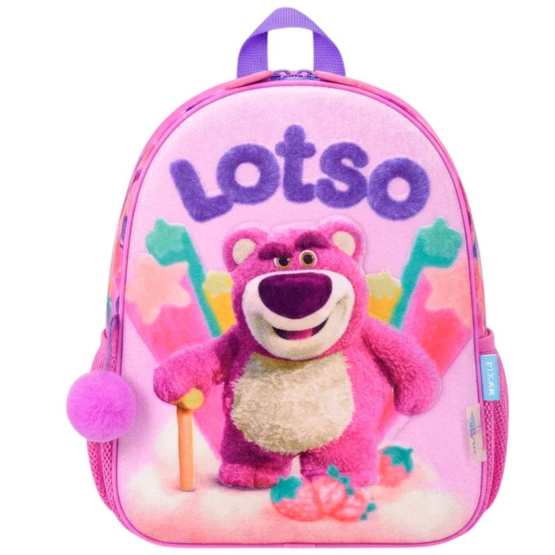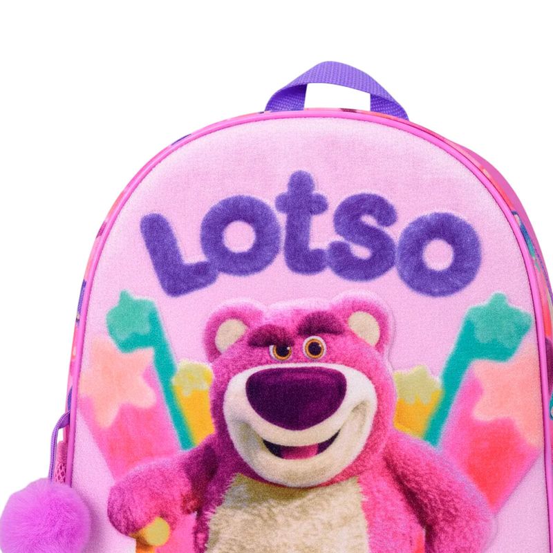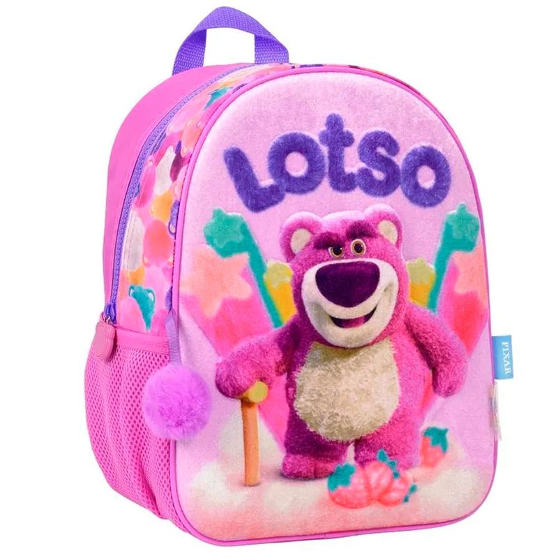 Mochila infantil ideal para jardín con diseño del personaje Lotso y textura de peluche suave, perfecta para los más pequeños.