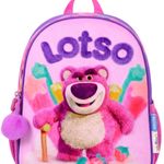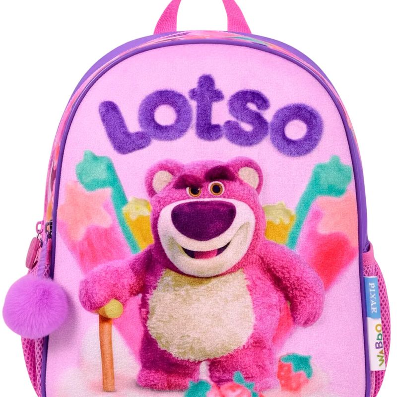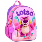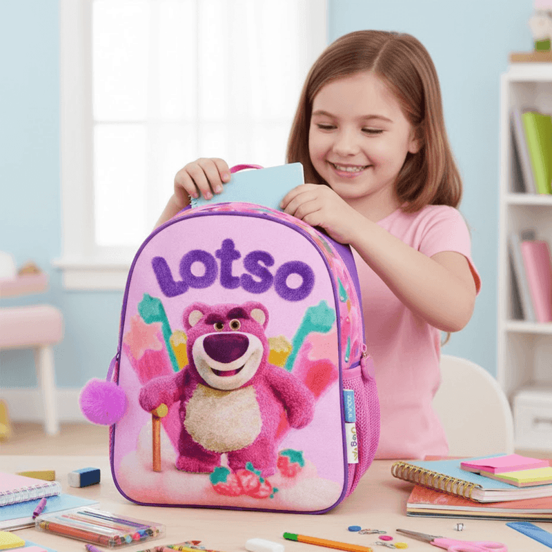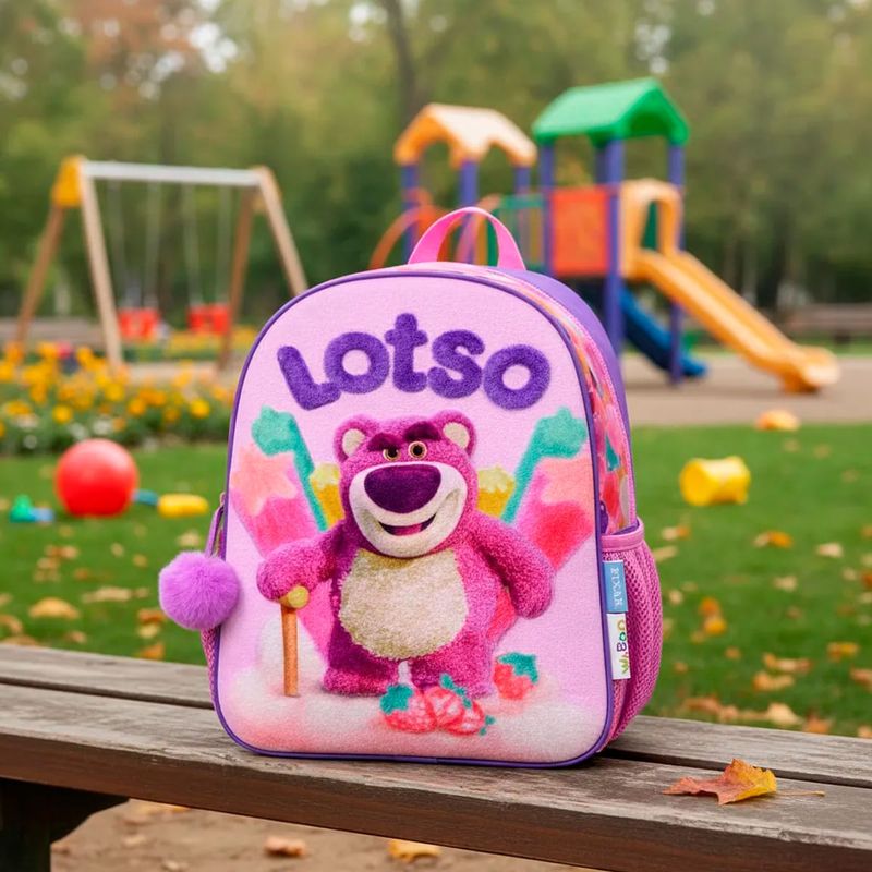 Mochila infantil ideal para jardín con diseño del personaje Lotso y textura de peluche suave, perfecta para los más pequeños.