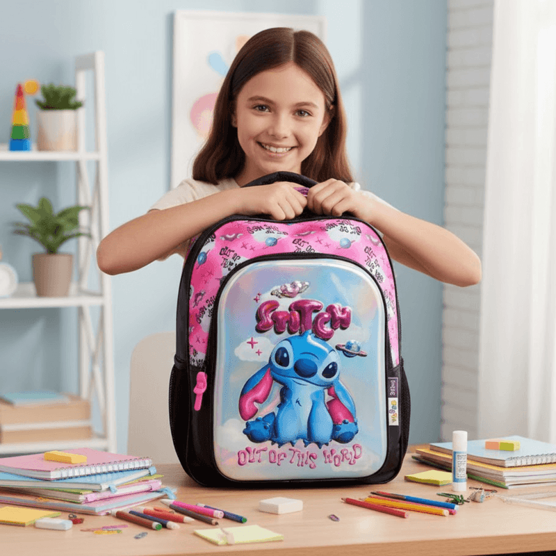 Mochila infantil con diseño Stitch Cute y frente en relieve 3D, ideal para quienes buscan estilo y funcionalidad en la rutina escolar.