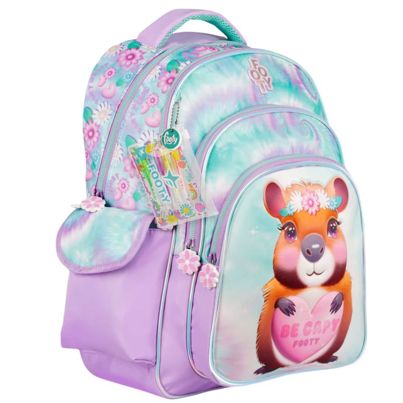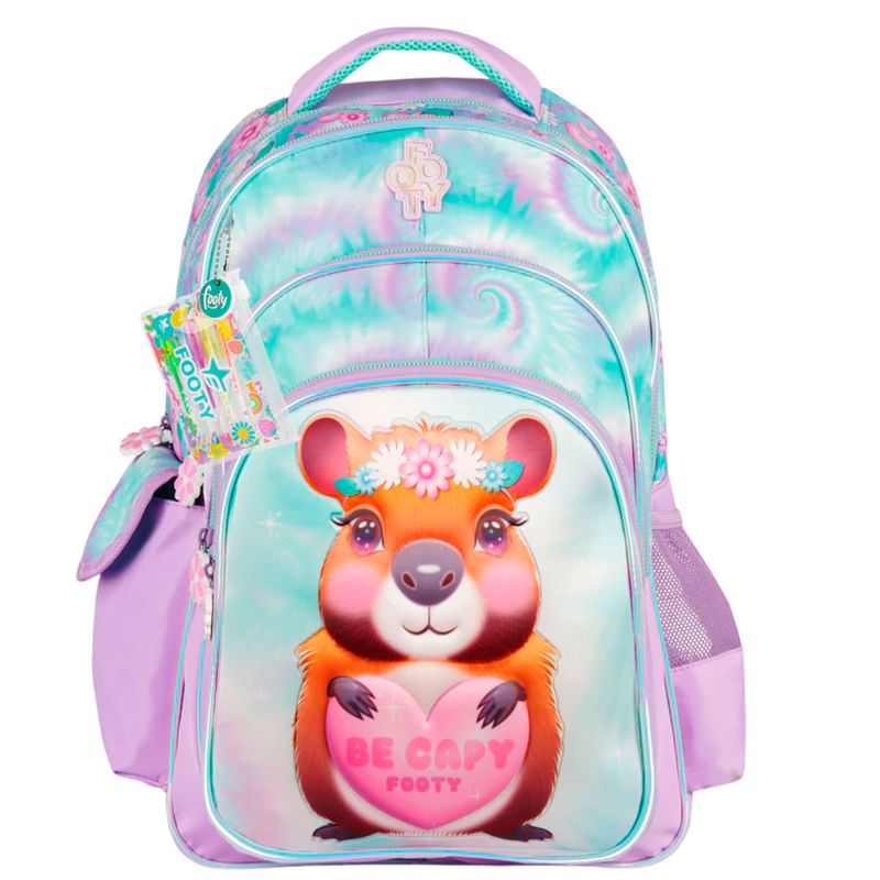 Mochila Footy Capybag con diseño batik y capybara en relieve, ideal para llevar todo con comodidad y estilo. Incluye estuche de regalo con 5 mini lapiceras.