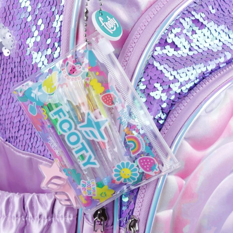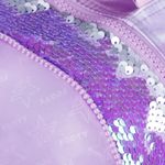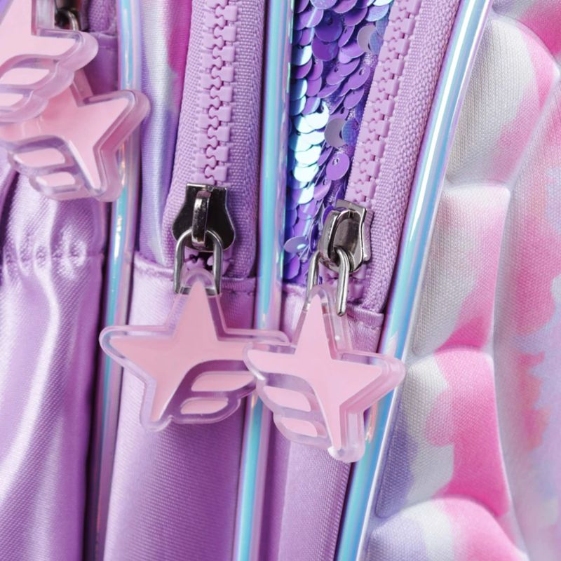 Esta mochila de espalda de 18 pulgadas combina gran capacidad, diseño original y materiales resistentes. Su tela de raso estampada batik con lentejuelas reversibles y detalles en EVA soft le aportan un estilo llamativo, ideal para el uso escolar diario.