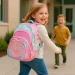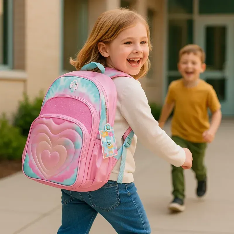 Esta mochila de espalda de 18 pulgadas combina gran capacidad, diseño original y materiales resistentes. Su tela de raso estampada batik con lentejuelas reversibles y detalles en EVA soft le aportan un estilo llamativo, ideal para el uso escolar diario.
