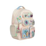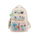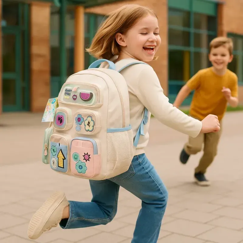 Esta mochila de espalda de 18 pulgadas combina gran capacidad, diseño moderno y funcionalidad para el uso escolar diario. Sus múltiples bolsillos y detalles decorativos en diferentes técnicas la convierten en una opción práctica y atractiva para llevar todo bien organizado.