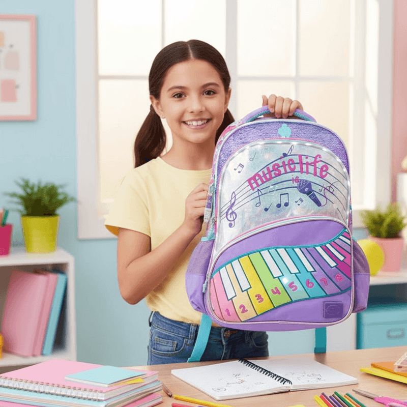 Mochila con luz LED, piano con sonido real y un diseño holográfico lleno de estilo. Ideal para uso diario y para llevar todo con comodidad.