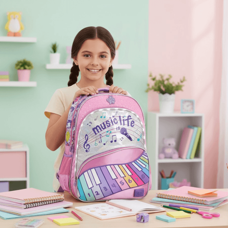 Una mochila práctica, resistente y divertida, perfecta para acompañar cada día con música y luz.