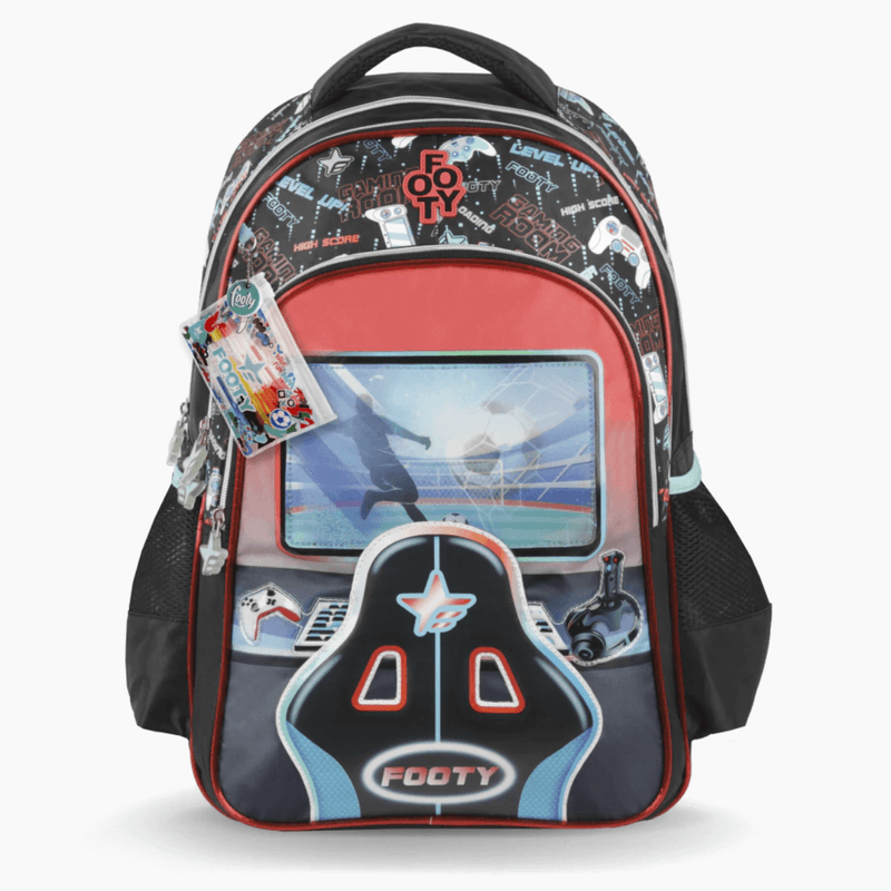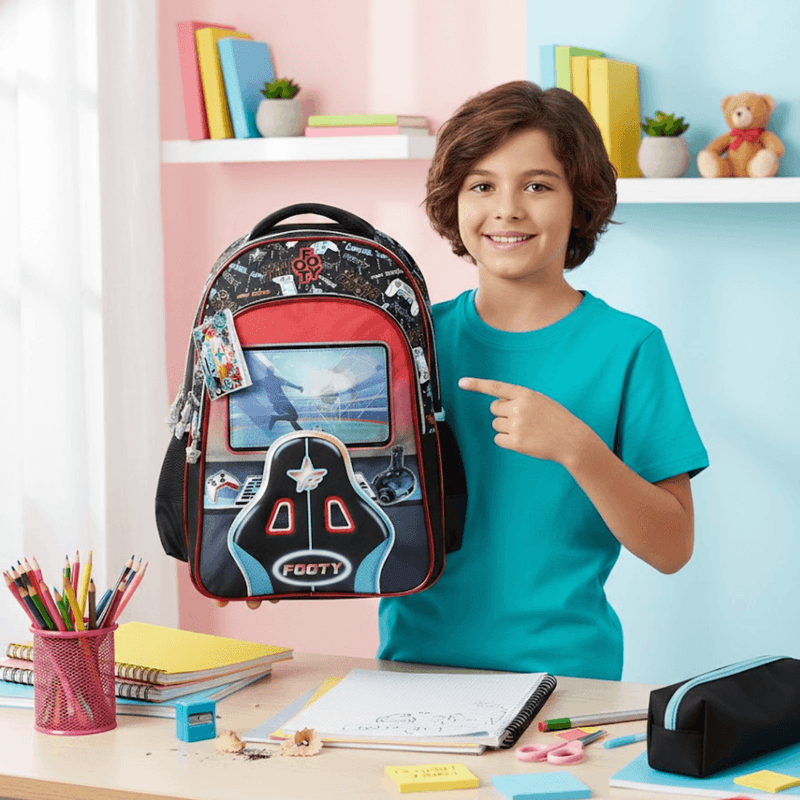 La Mochila Footy Gamer 18" es perfecta para los chicos que aman el mundo del gaming. Con un diseño moderno y llamativo, su frente destaca por el aplique de sillón gamer y la pantalla con mooving patch de gol, acompañado de una estampa sublimada con el clásico logo Footy.
