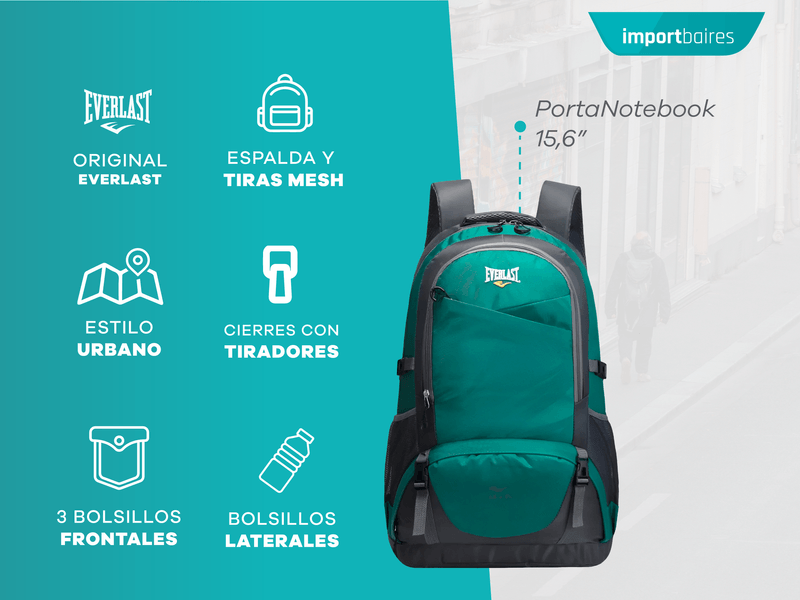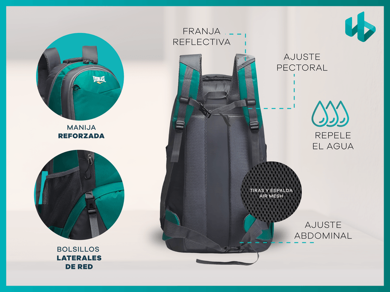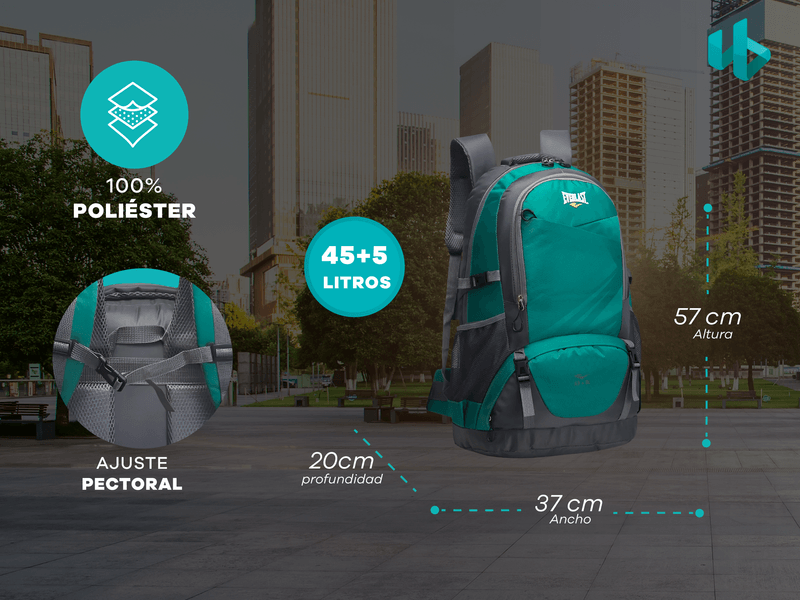 Mochila de viaje Everlast con una capacidad de 50 litros. Confeccionada con poliéster resistente, cuenta con un ajuste pectoral para una óptima distribución del peso y varios bolsillos para una organización eficaz. Cómoda, funcional y amplia.