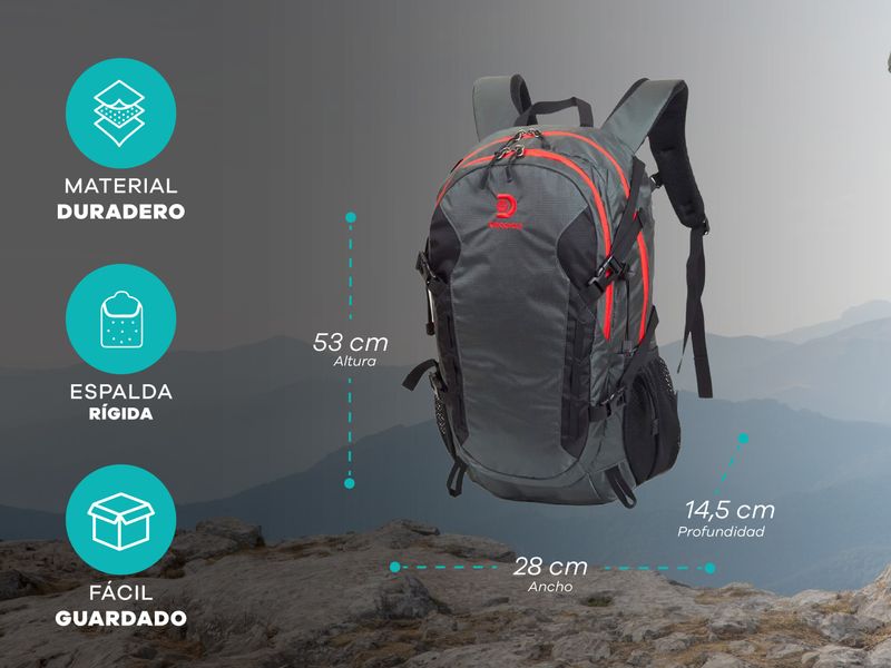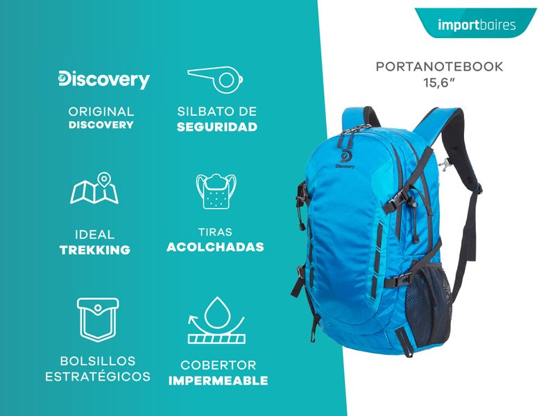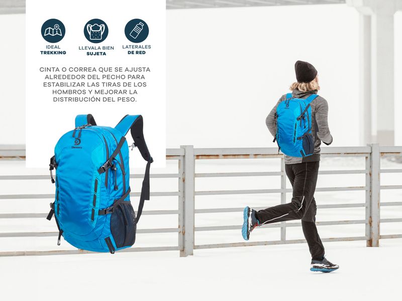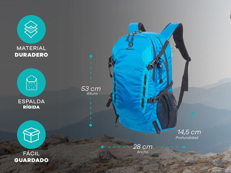 Mochila de Camping Discovery. Es espaciosa, posee un diseño ergonómico para llevar cómodamente, funda para lluvia y salida para bolsa hidratación. Disfrutá de tus aventuras con una mochila confiable, resistente y funcional.