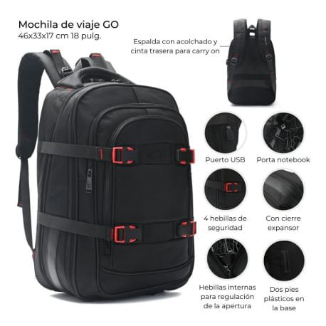 Esta mochila GO se destaca por su mezcla de funcionalidad, diseño y versatilidad. No es simplemente una mochila: es una aliada de viaje que se adapta a tus necesidades diarias y a los retos que surgen cuando estás en movimiento. Con el expansor, puedes partir ligero y luego ampliarte para llevar lo que necesites. El puerto USB y el compartimento para notebook la hacen perfecta para quienes necesitan mantenerse conectados. Cada detalle —desde la cinta para carro hasta los bolsillos organizadores— está pensado para facilitar tu experiencia de viaje.