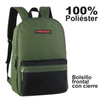 100% Poliéster contiene un bolsillo frontal con cierre, un compartimiento principal forrado por dentro en su parte posterior, y tiras y espalda acolchadas.