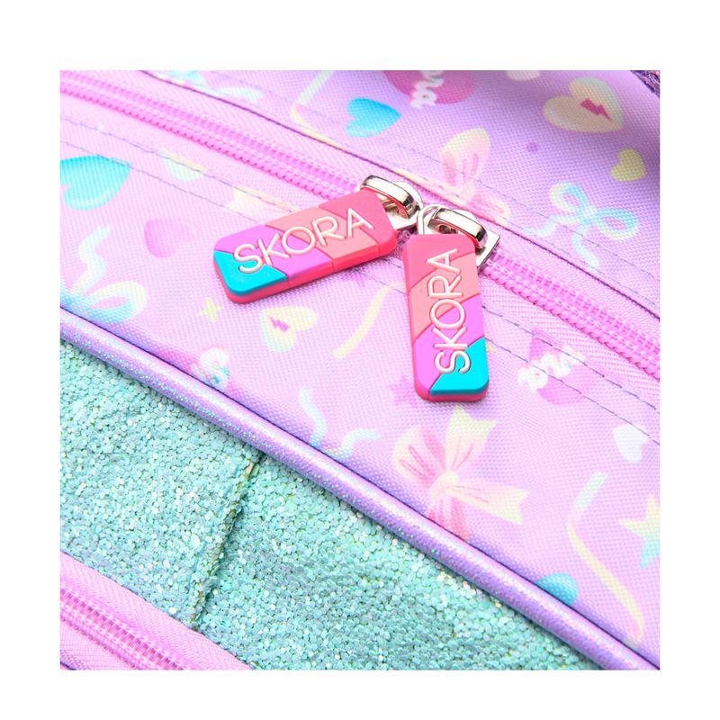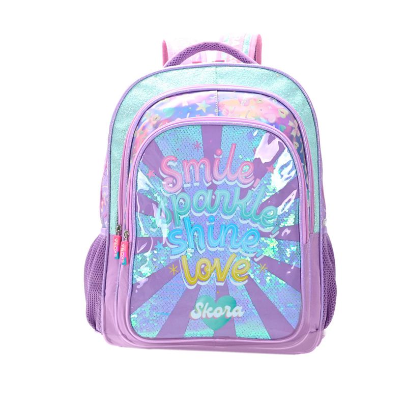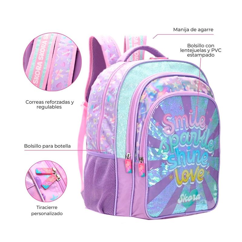 Con su diseño alegre y juvenil, esta mochila combina practicidad y estilo. Es perfecta para estudiantes que buscan un accesorio funcional y atractivo para la escuela o actividades diarias.