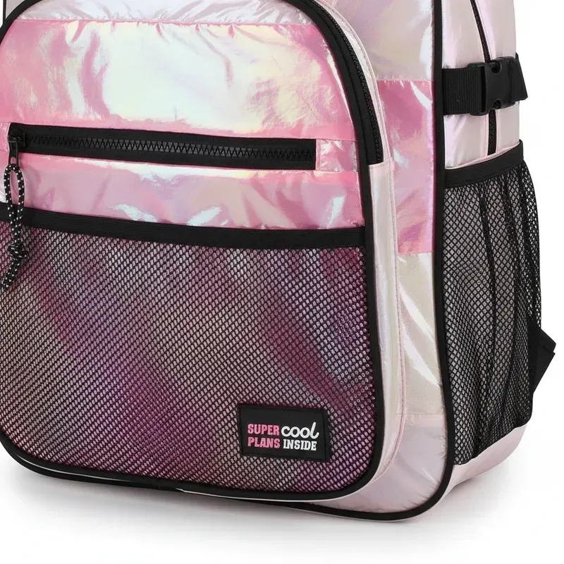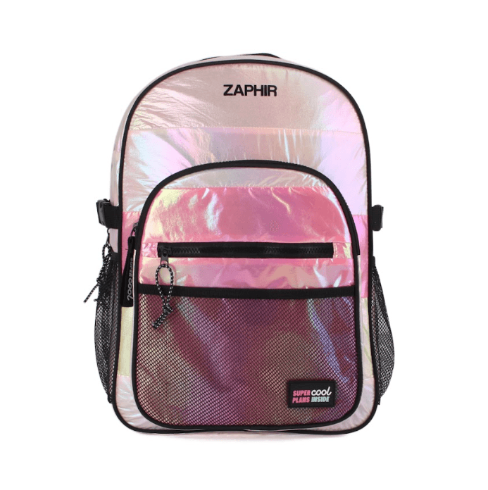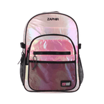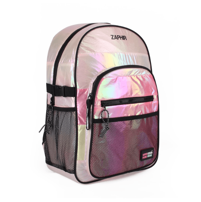 Mochila de 18" de espalda con recortes de distintos colores. Tiene broches en el frente para enganchar la lonchera. Medidas aproximadas: 43 x 30 X 18 cm Marca: Zaphir.