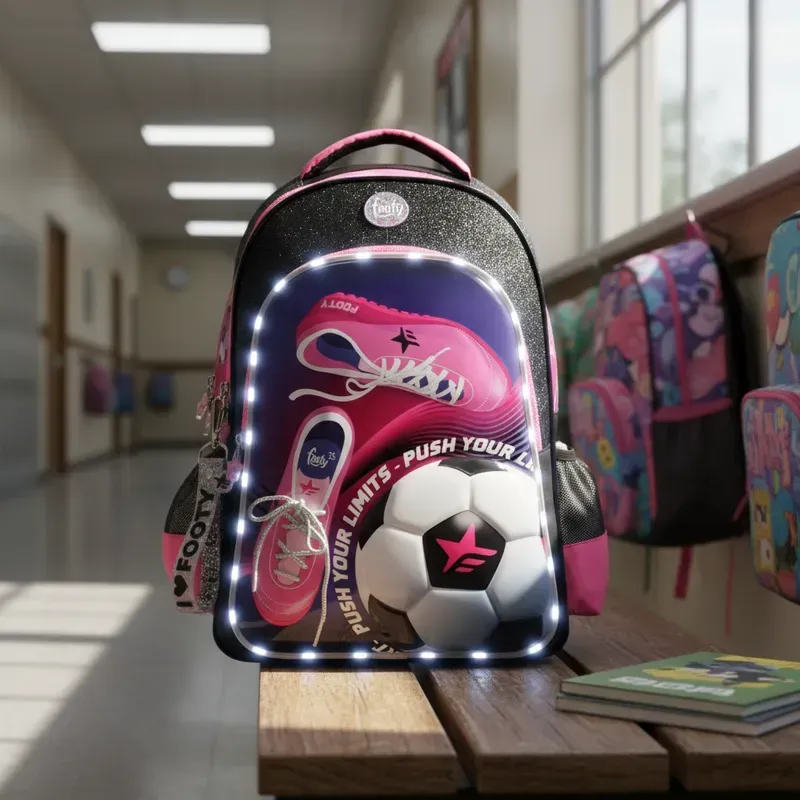 ¡Lleva el estilo y la energía del fútbol con la Mochila Espalda 18 Footy Girls Soccer Luz Led en color negro! Perfecta para las niñas que desean destacar y tener todo lo necesario a mano, esta mochila combina funcionalidad, diseño y un toque divertido con luces LED.