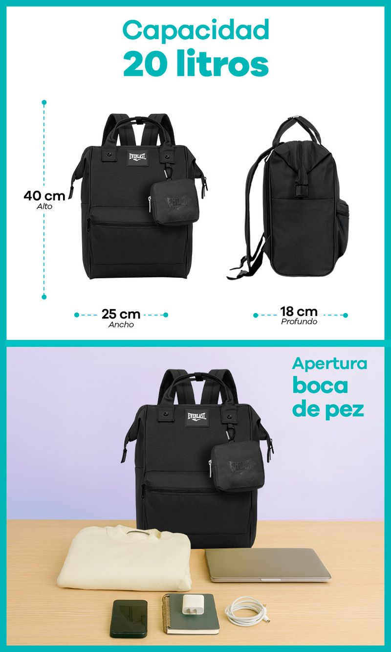 -Compartimiento principal con capacidad para una notebook de 14 pulgadas, cuaderno universitario o carpeta.
