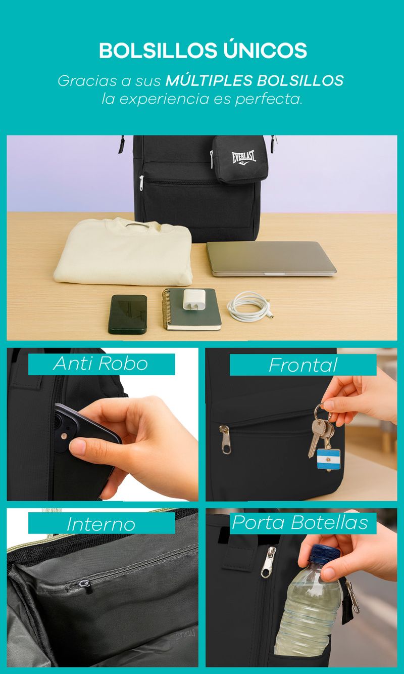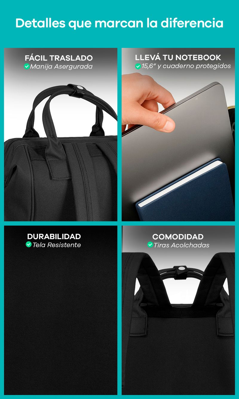 -Compartimiento principal con capacidad para una notebook de 14 pulgadas, cuaderno universitario o carpeta.